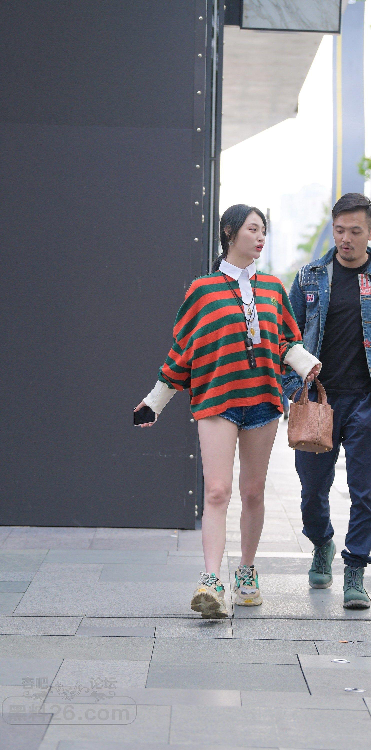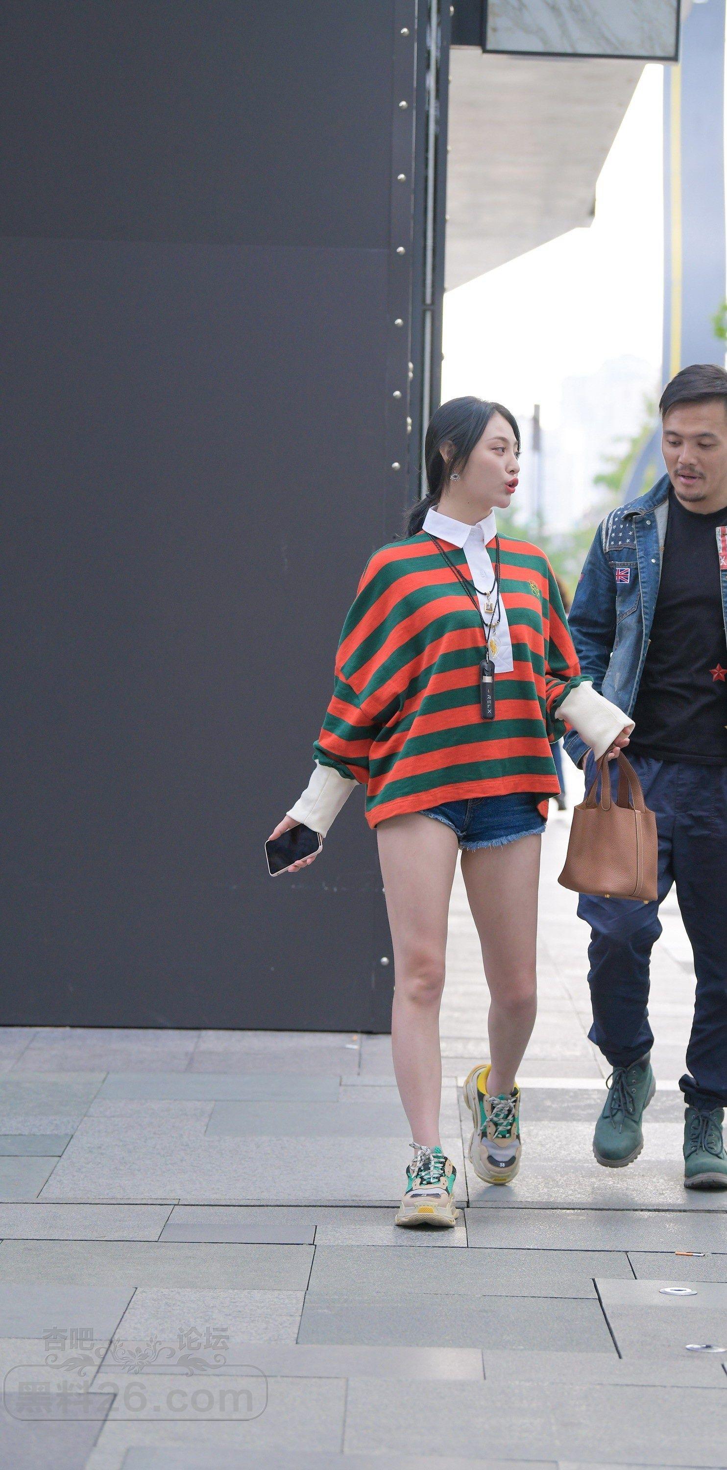 红绿格子牛仔短裤马尾妹子和男友步行街路过腿很白【10P】