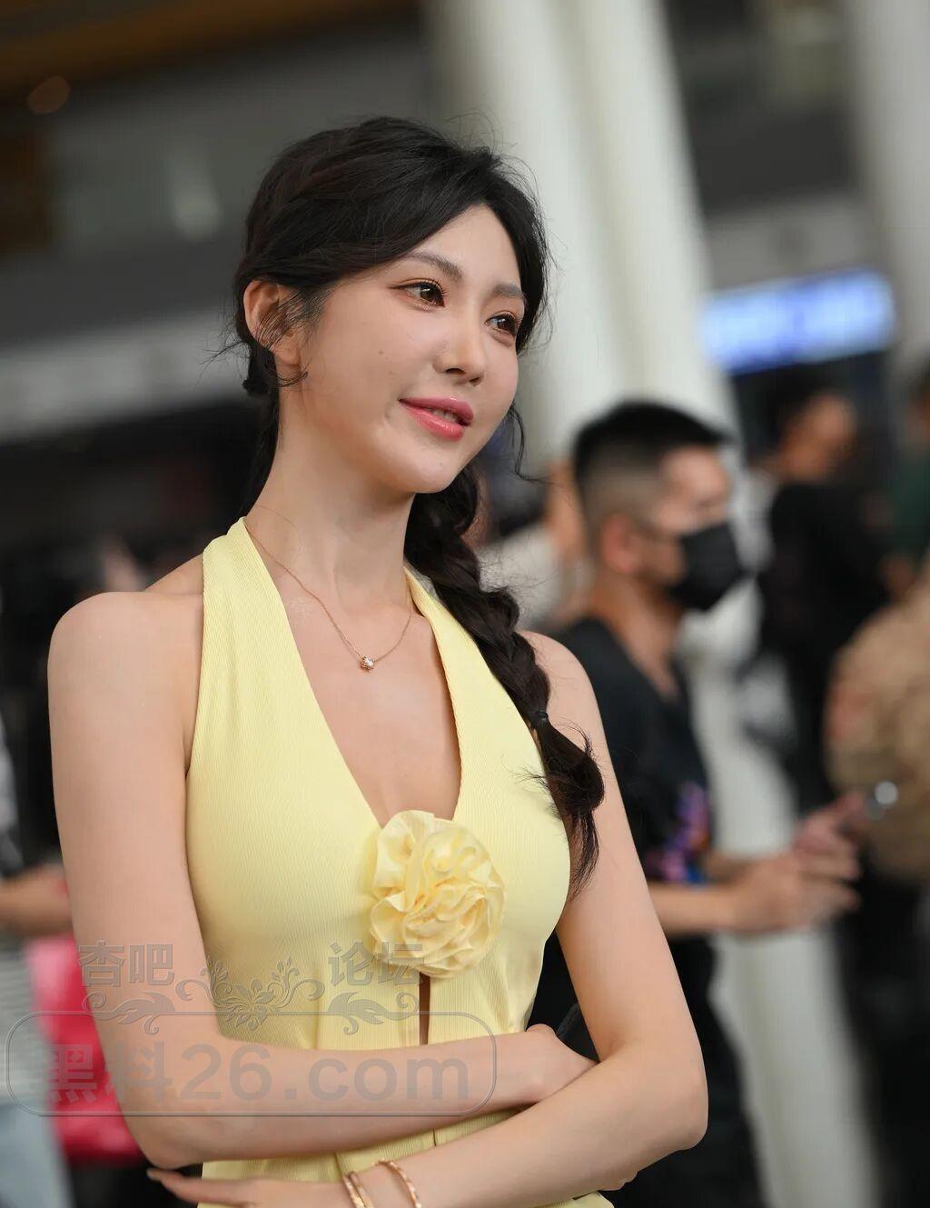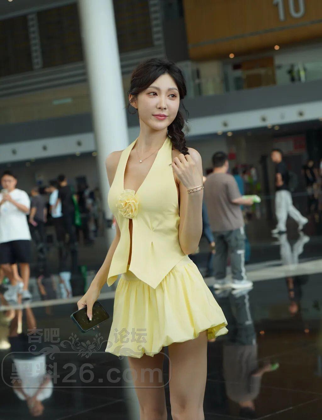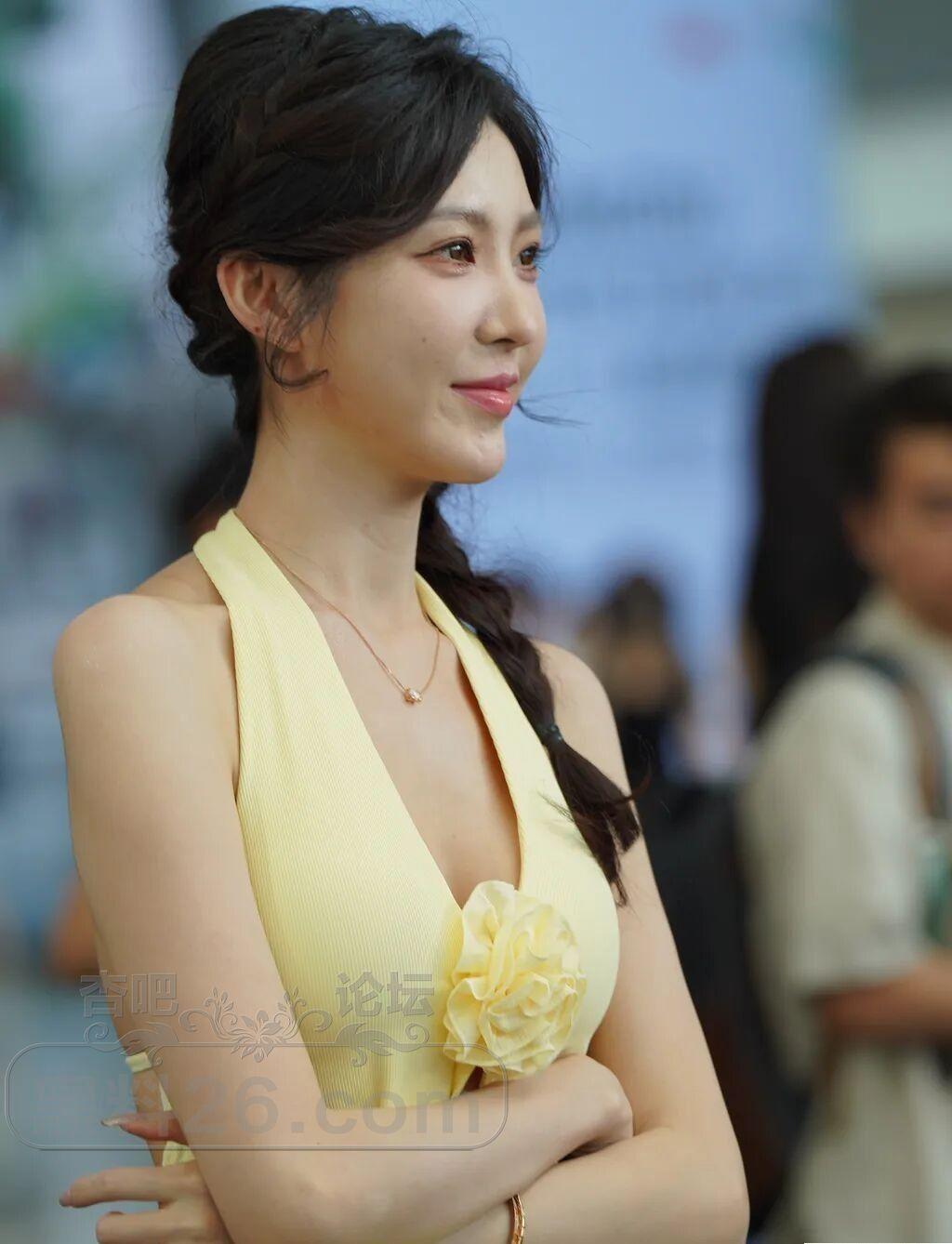 车模小姐姐的四套浅色服装与小麦色的皮肤都很般配,尤其那身鹅黄色的露背装更靓丽。