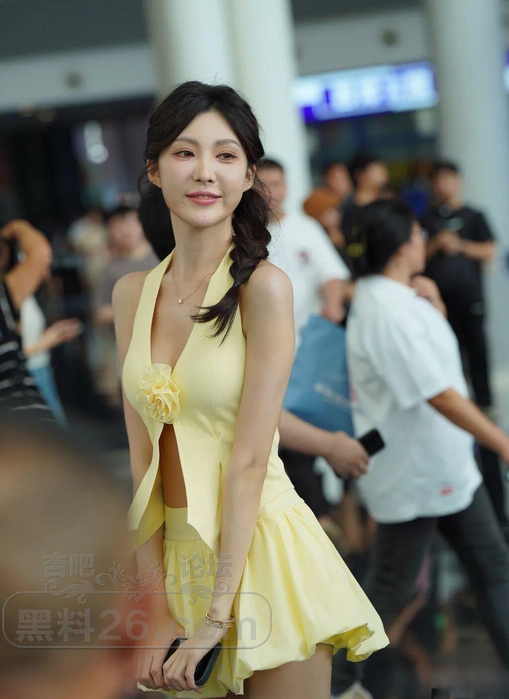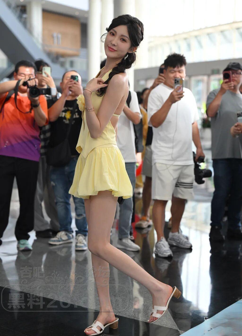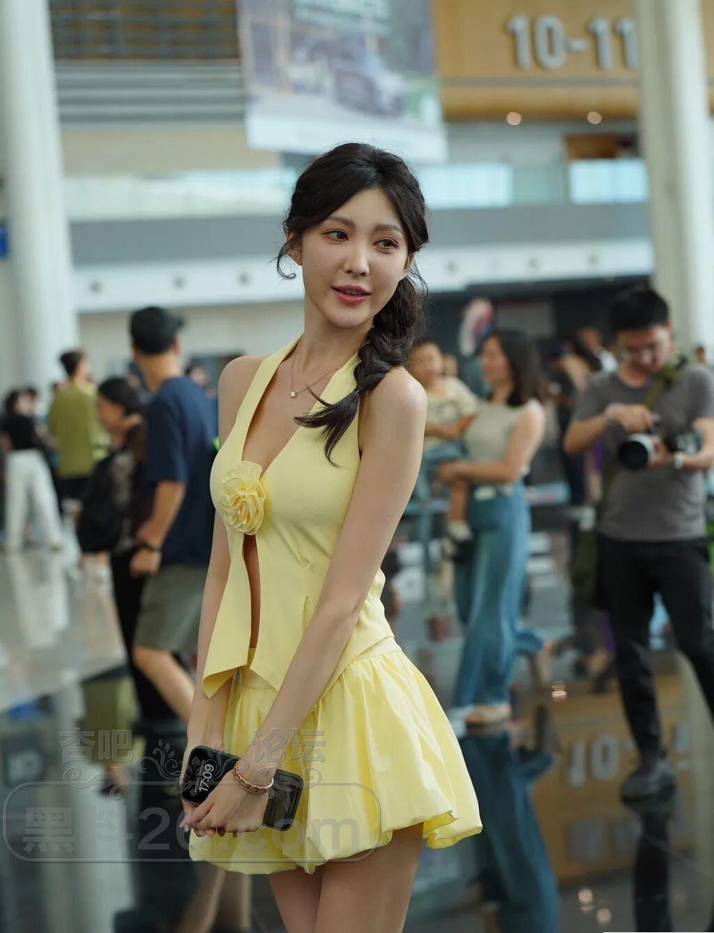 车模小姐姐的四套浅色服装与小麦色的皮肤都很般配,尤其那身鹅黄色的露背装更靓丽。