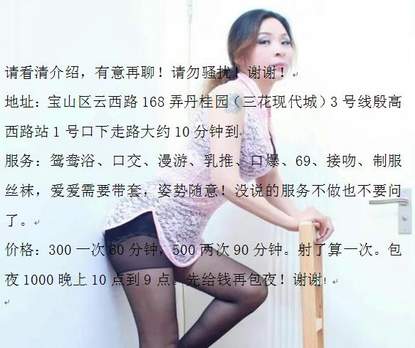 【寻欢地址】:宝山区殷高路 【服务项目】:ML 【小姐数量】:1 【小姐年龄】:38 【小姐外形】:80 【价格一览】:300/p 500/pp 【环境设备】:该有都有 【安全评估】:90 【营业时间】:能联系上就可以 【联系方式】: